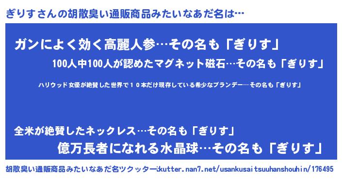 | 意味不明あだ名 | 『住所不定無職ぎりす(81歳)』『自称ぎりす』 |
