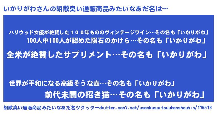 | 男性向けラノベタイトル風あだ名 | 『いかりがわの嫁は女の子じゃないと思った?』 |