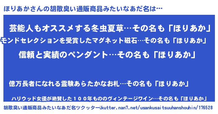 | 意味不明あだ名 | 『しいたけ科ほりあか属』『自称ほりあか』 |