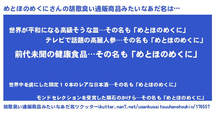 | 男性向けラノベタイトル風あだ名 | 『めとほのめくに~年齢イコール彼女いない歴の魔法使い~』 |