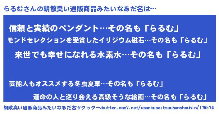 | 女子向けラノベタイトル風あだ名 | 『らるむの契約王妃』『らるむ様がみてる』 |