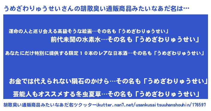 | 男性向けラノベタイトル風あだ名 | 『うちのうめざわりゅうせいが世界を掌握している!』 |