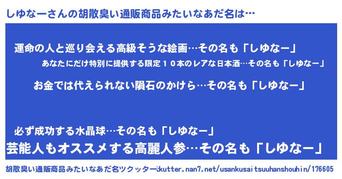 | ヘコむあだ名 | 『なまこ酢』『しゆもー』『しゆお』 |