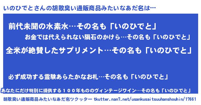| 男性向けラノベタイトル風あだ名 | 『いのひでとの嫁は女の子じゃないと思った?』 |