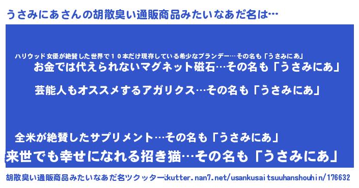 | ヘコむあだ名 | 『うさみにあ(笑)』『うさっちょ』 |
