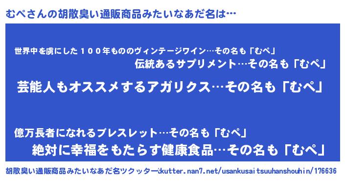 | 意味不明あだ名 | 『自称むぺ』『住所不定無職むぺ(65歳)』 |