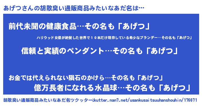 | 意味不明あだ名 | 『とにかく怪しいあげつ』 |