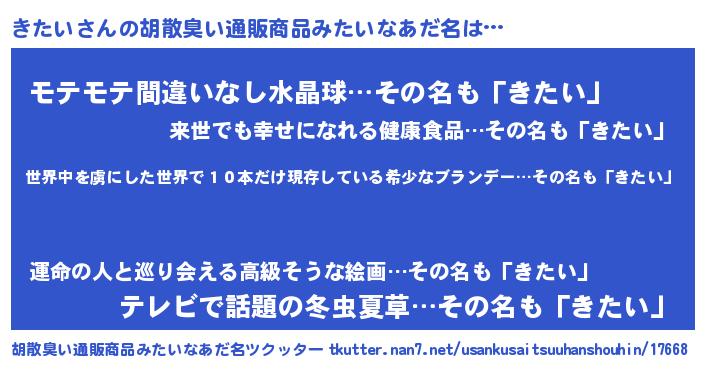 | 意味不明あだ名 | 『住所不定無職きたい(74歳)』『自称きたい』 |