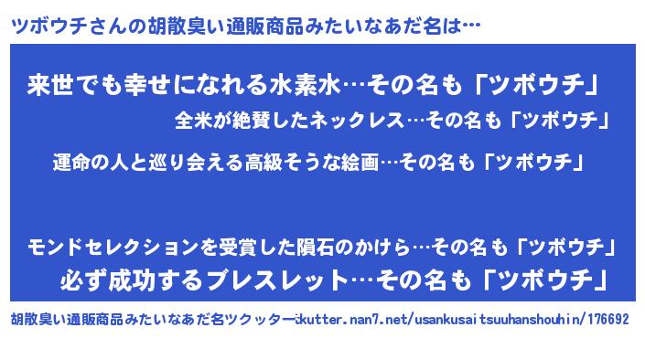| 肩書あだ名 | 『ツボウチ総理大臣』『ツボウチ上級大将』 |