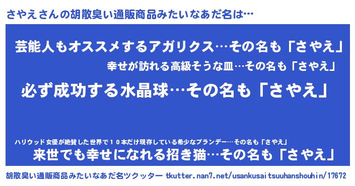 | ヘコむあだ名 | 『さやふぇ~』『さやえ(笑)』 |