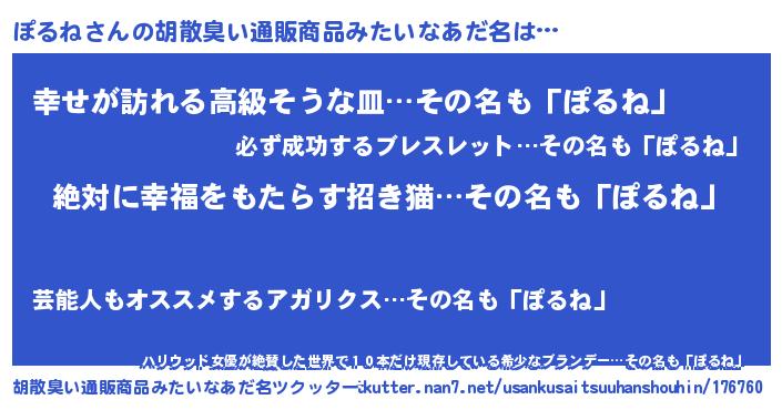 | 男性向けラノベタイトル風あだ名 | 『ぽるねという概念が存在しない退屈な世界 』 |