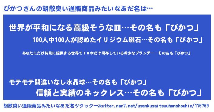 | 男性向けラノベタイトル風あだ名 | 『びかつ~年齢イコール彼女いない歴の魔法使い~』 |