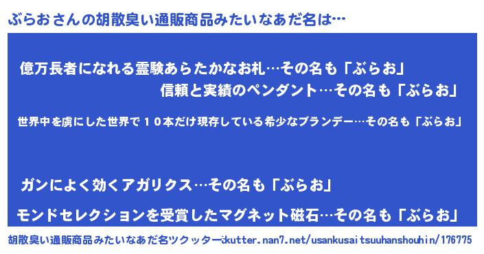 | 男性向けラノベタイトル風あだ名 | 『この素晴らしい世界にぶらおを!』 |