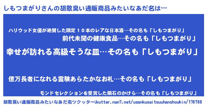 | 意味不明あだ名 | 『しもつまがりフォーエバー』 |
