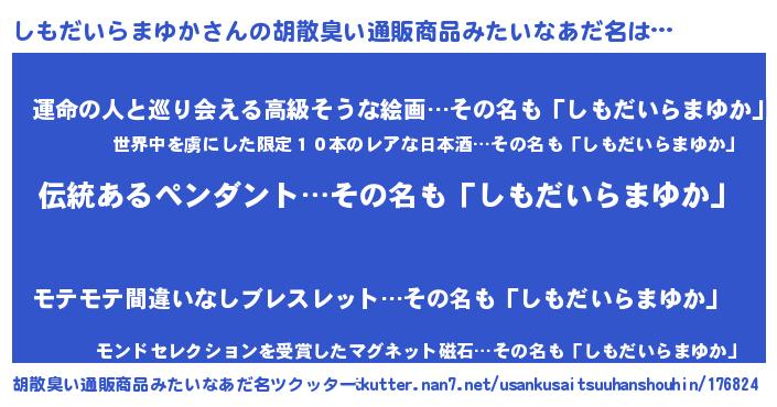 | 意味不明あだ名 | 『とにかく怪しいしもだいらまゆか』 |