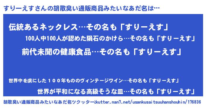 | ヘコむあだ名 | 『すりーえす(苦笑)』『すり太郎』 |
