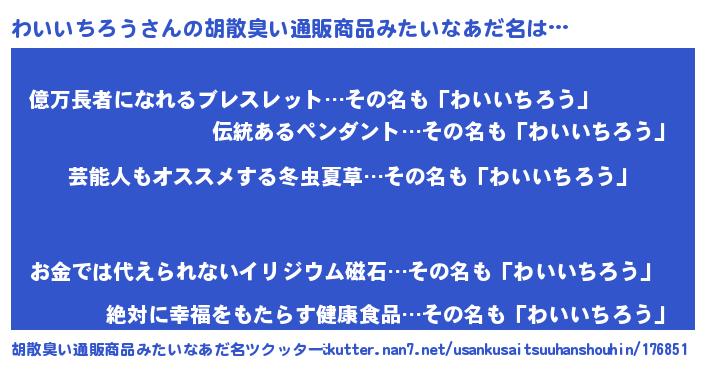 | 男性向けラノベタイトル風あだ名 | 『わいいちろう~年齢イコール彼女いない歴の魔法使い~』 |