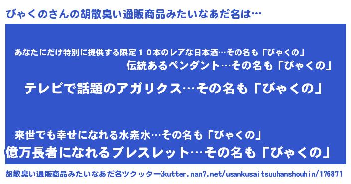 | ヘコむあだ名 | 『びゃにゅー』『びゃ太郎』『つくし』 |