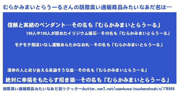 | 男性向けラノベタイトル風あだ名 | 『むらかみまいとらうーるの憂鬱』 |