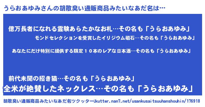 | 意味不明あだ名 | 『住所不定無職うらおあゆみ(50歳)』 |