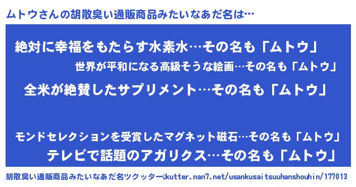 | 意味不明あだ名 | 『とにかく怪しいムトウ』『自称ムトウ』 |