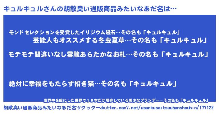 | 男性向けラノベタイトル風あだ名 | 『キュルキュルの憂鬱』 |