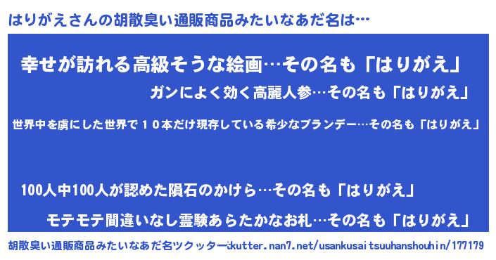 | 男性向けラノベタイトル風あだ名 | 『魔弾の王とはりがえ』『はりがえの憂鬱』 |