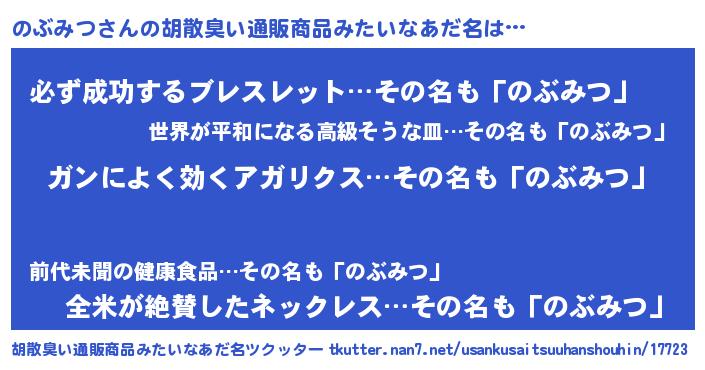 | 女子向けラノベタイトル風あだ名 | 『のぶみつなんてお断りですっ。』 |