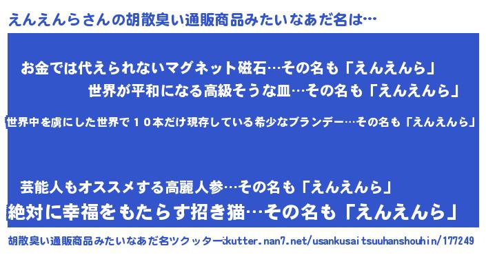 | 意味不明あだ名 | 『住所不定無職えんえんら(77歳)』 |