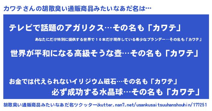 | 意味不明あだ名 | 『もやし科カワテ属』『自称カワテ』 |