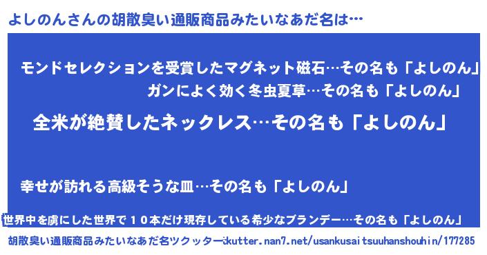 | 男性向けラノベタイトル風あだ名 | 『よしのんの嫁は女の子じゃないと思った?』 |