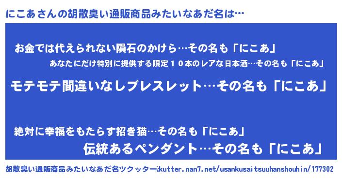 | ヒーロー風カッコイイあだ名 | 『スーパーニコア』『正義の使者にこあ』 |