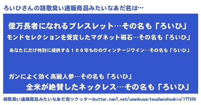 | 男性向けラノベタイトル風あだ名 | 『この素晴らしい世界にろいひを!』 |