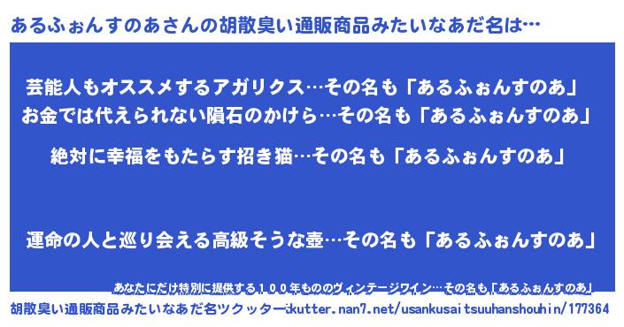 | 男性向けラノベタイトル風あだ名 | 『あるふぉんすのあという概念が存在しない退屈な世界 』 |