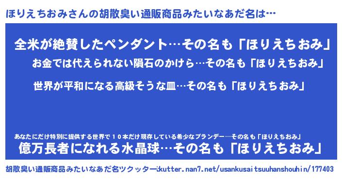 | 男性向けラノベタイトル風あだ名 | 『転生したらほりえちおみだった件』 |