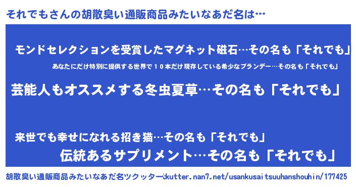 | 意味不明あだ名 | 『自称それでも』『つくし科それでも属』 |