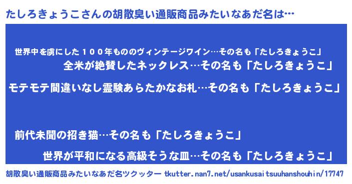| 恥ずかしいあだ名 | 『プリティーたしろきょうこ』『たしちん』 |