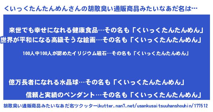 | 男性向けラノベタイトル風あだ名 | 『おまえをオタクにしてやるから、俺をくいっくたんたんめんにしてくれ! 』 |