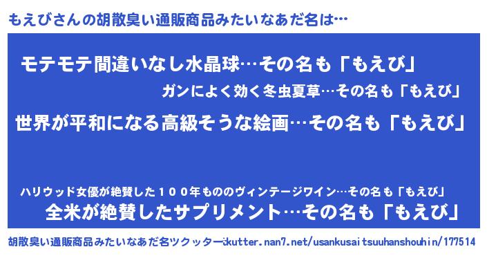 | 女子向けラノベタイトル風あだ名 | 『もえび伯爵の花嫁』『もえび様がみてる』 |
