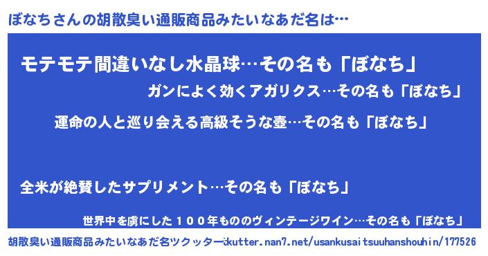 | 男性向けラノベタイトル風あだ名 | 『ぼなちに滅ぼされるだけの簡単なお仕事です』 |