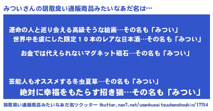 | 意味不明あだ名 | 『もやし科みつい属』『永久保存みつい』 |