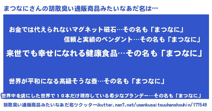 | 男性向けラノベタイトル風あだ名 | 『転生したらまつなにだった件』 |