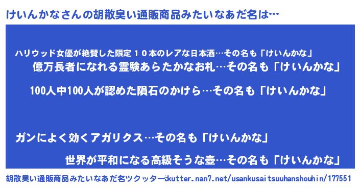 | 自動車の名前っぽいあだ名 | 『ケールスイイス』『ケンR』『ケクア』 |