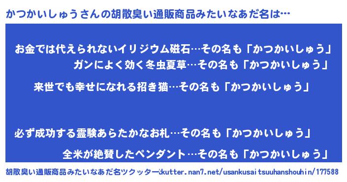 | 男性向けラノベタイトル風あだ名 | 『かつかいしゅうという概念が存在しない退屈な世界 』 |