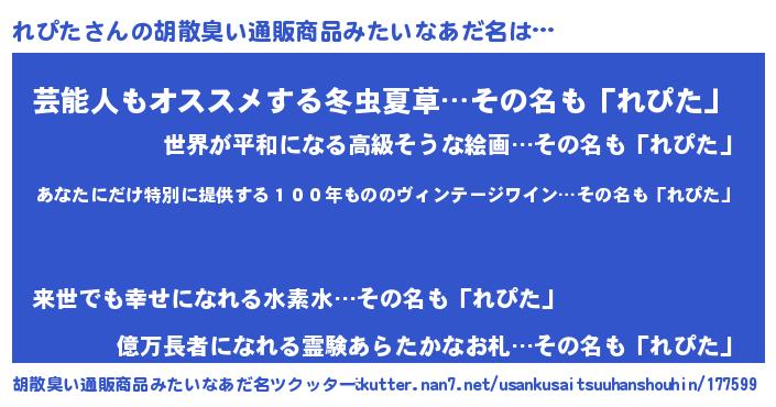 | 男性向けラノベタイトル風あだ名 | 『この素晴らしい世界にれぴたを!』 |