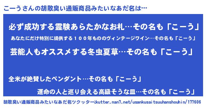 | 男性向けラノベタイトル風あだ名 | 『Re:こーうから始める異世界生活』 |