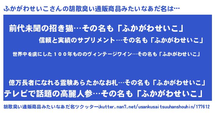 | ヘコむあだ名 | 『ふかがわせいこ(笑)』『ふかお』 |