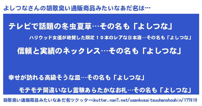 | 男性向けラノベタイトル風あだ名 | 『ダンジョンによしつなを求めるのは間違っているだろうか』 |