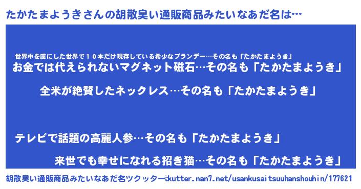 | 男性向けラノベタイトル風あだ名 | 『たかたまようきの嫁は女の子じゃないと思った?』 |