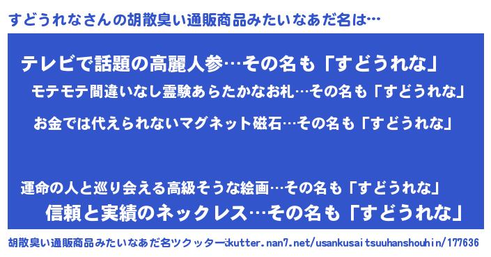 | ヒーロー風カッコイイあだ名 | 『慈愛の使者すどうれな』『黄金騎士スド』 |